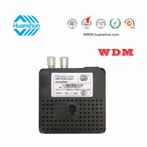 WDM型雙輸出光接收機 | HSGS10076W/2 | CATV 1540~1565nm接收,-5~-15dBm/RF 2×72dBuv恒流輸出,PON:1490/1310nm;外接90~255V 5V 0.5A電源適配器 |